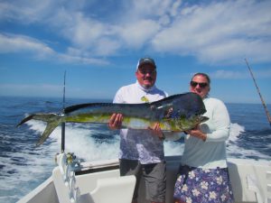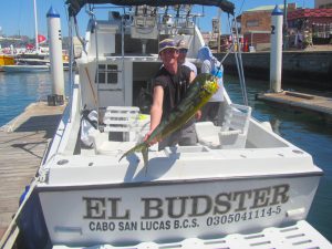 Fishing on the EL BUDSTER PRIDE. The JANIS SORTER´S party, CAUGHT TWO 15-20 LB. DORADO. The fish was caught 15 miles from the coast of Cabo San Lucas. The water temperature was 70-71 degrees.