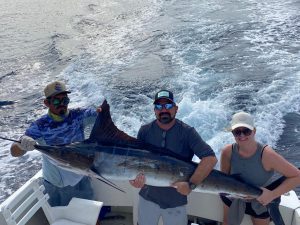 Fishing on the EL BUDSTER. The JEREMY WEISS´S party, CAUGHT AND RELEASED THREE 110-120 LB. STRIPED MARLIN. The fish was caught 15 miles from the coast of Cabo San Lucas. The water temperature was 71-74 degrees.